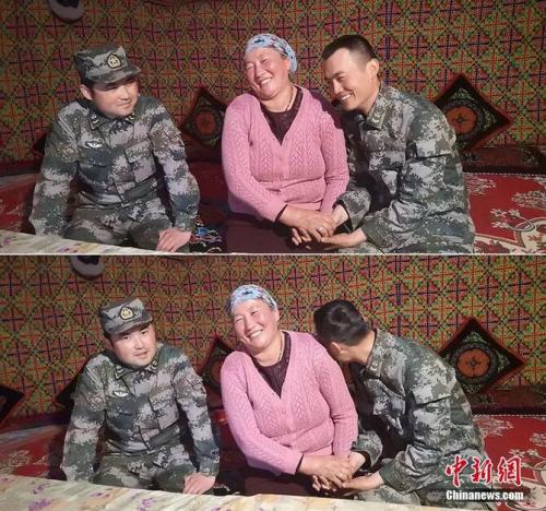 被问及婚事,王鑫(右一)害羞地躲在哈萨克妈妈肩头,旁边的祖侬(左一)是连队的翻译。王珊珊 摄