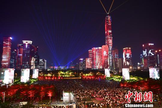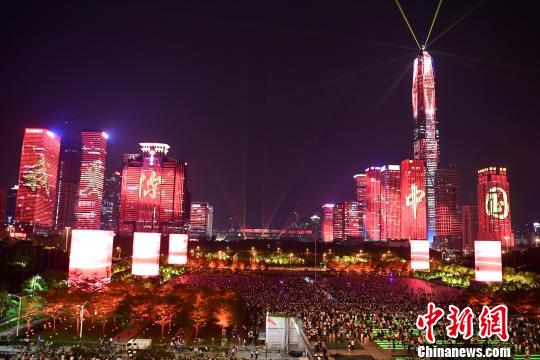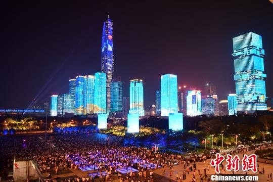 中新网深圳9月28日电 (记者 郑小红 陈文)28日晚,深圳中心区的夜空被118万个LED点光源点亮。43栋楼宇灯光联动,“辉煌新时代”深圳中心区灯光表演正式首秀。