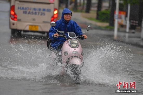 资料图:海南昌江民众冒雨涉水出行。中新社记者 骆云飞 摄