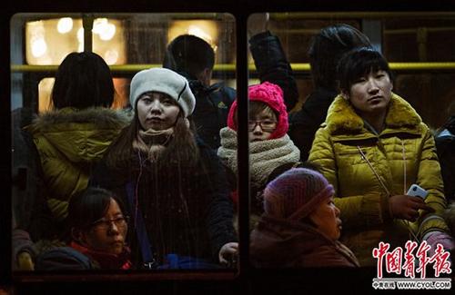 北京街头的公交车上,身陷下班晚高峰的人们,日复一日地忍耐着通勤压力。中国青年报·中青在线记者 郑萍萍/摄