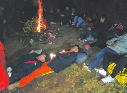 由于当晚需要守电,这6名队员和其他抢险人员便挤在一处篝火旁,困了,就轮流倒在地上小睡一会。“晚上下了雨,我们就在火边靠在一起取暖。”