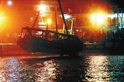 21时31分按照现场指挥部指令开始起吊,离底起吊重力8.7吨。23时45分公交车整体被打捞出水面。可见公交车车辆结构部分受损。现场救援船只鸣笛致哀。参与救援的全体人员和相关单位工作人员在现场默立哀悼。