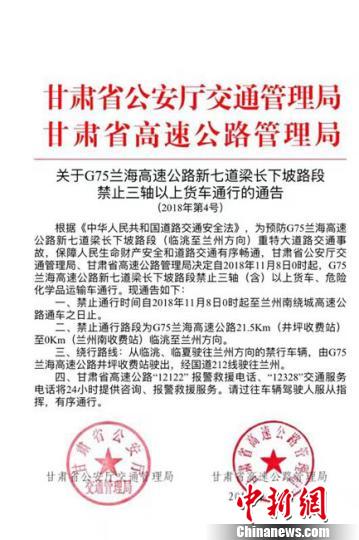 由甘肃省公安厅交通管理局联合甘肃省高速公路管理局发布的这份通告显示,G75兰海高速公路新七道梁长下坡路段禁止三轴(含)以上货车、危险化学品运输车通行时间自2018年11月8日0时起至兰州南绕城高速公路通车之日止。