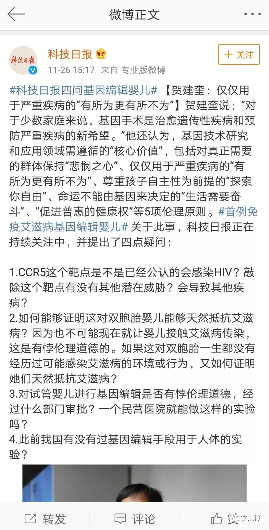 “这事件已经远远超出了技术问题的范畴,后果不可预测,一定是伦理争论的焦点。即使技术是100%可靠,人类是否可以或应该编辑自己的生殖细胞和胚胎?(看到这个消息)绝大多数人肯定大脑一片空白,包括我自己。”清华大学艾滋病综合研究中心常务副主任张林琦对第一财经记者表示。