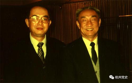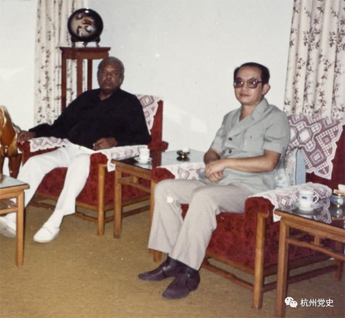1987年,中国驻巴巴多斯代理大使厉声教(右)与西印度杰出政治家、巴巴多斯“独立之父”、首任总理兼时任总理巴罗(Errol Barrow)在中国大使馆。
