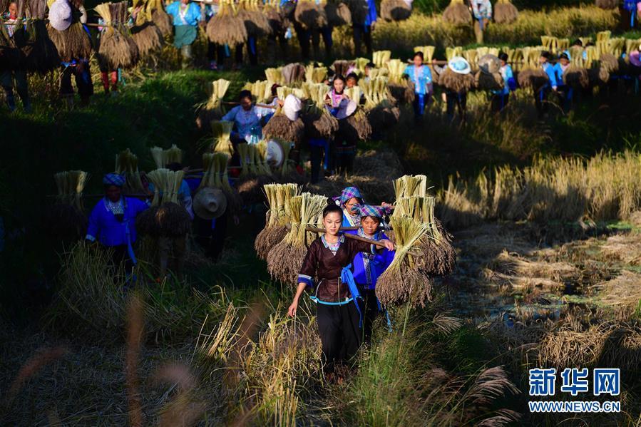 在广西融水苗族自治县安太乡元宝村,村民挑着香糯走在田间(10月30日摄)。 新华社记者 黄孝邦 摄