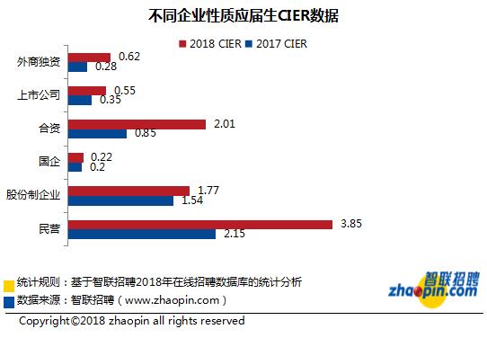 民营企业、合资企业和股份制企业的大学生就业景气度最高,分别为3.85、2.01和1.77,这些企业对应届生的需求也持续上升,与去年同期针对应届生的招聘人数相比,分别增长了109.33%,74.43%及47.66%。