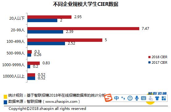 整体来看,中小微企业的应届生就业景气度较高。其中,20-99人以及100-499人的中小企业CIER指数分别达到7.47和5。其中20-99人规模的企业针对应届生的需求人数同比增加了2倍,而投递人数却降低了2.55%,100-499规模的企业中,应届生需求人数增长了89.86%,求职人数降低了4.47%。
