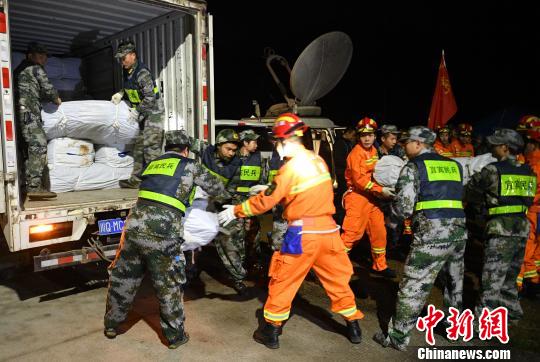 记者17日凌晨在四川省宜宾市兴文县周家镇的临时安置点看到,尽管已是凌晨,但不少志愿者仍在安置点外整理方便面、矿泉水等救援物资,武警、民兵和矿山救护队员们正帮村民搭建着刚运抵的帐篷。