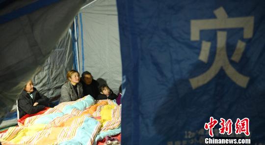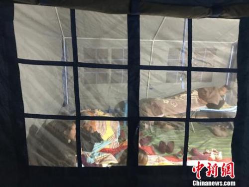 由于帐篷还没有全部搭建完成,搭建好的帐篷并不能满足村民们的需要,每个帐篷里都住满了村民。大家或靠坐在一起,或躺下休息,身上盖着统一发放的御寒棉被。