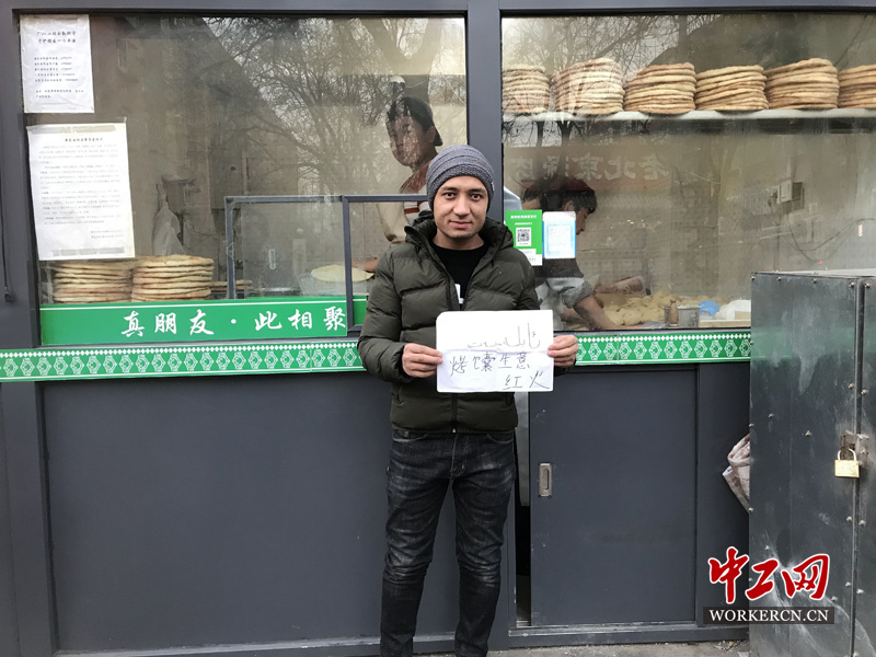 三年前,他不远千里从新疆来到北京,在一间只有3平米大小的门店里开启了自己的烤馕事业。他告诉我,在这三年里,他们几乎每天不到5点就要起床,开始准备饭店预定的烤馕,有时一直忙碌到晚上11点。现在,他的烤馕店已经发展到五、六个人,而且订单也越来越多。2019年他最大心愿是:烤馕越做越好,生意越来越红火。中工网记者 郭丽娟摄