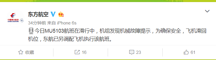 今天中午东航正式回应称MU5103航班在滑行中,机组发现机械故障提示,为确保安全,飞机滑回机位,东航已另调配飞机执行该航班。(央视记者 郭臻)
