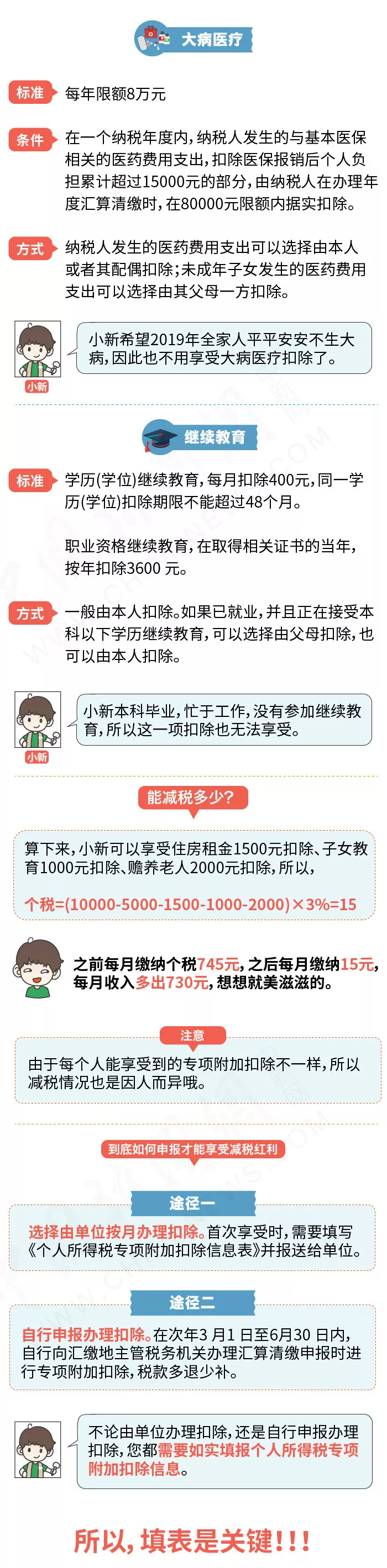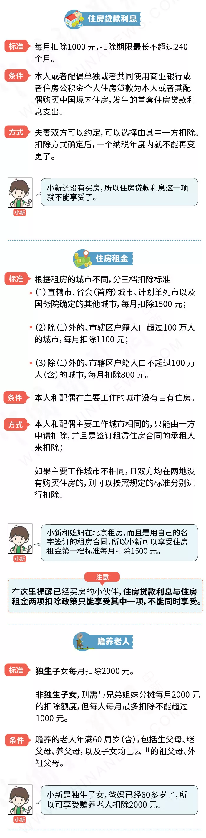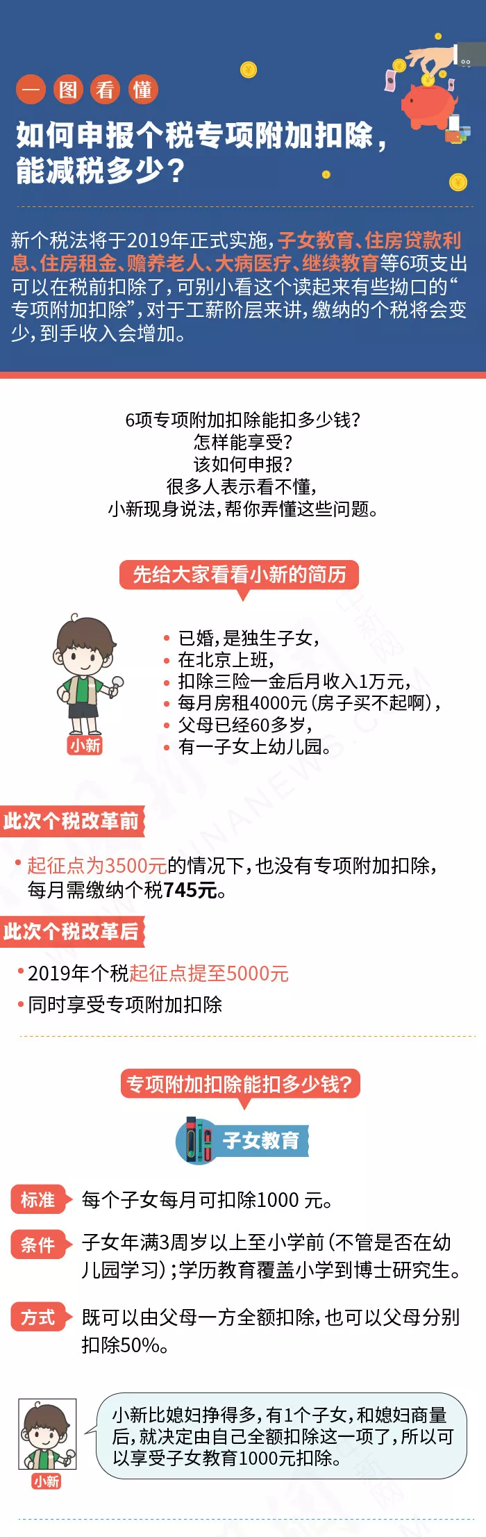 新个税法将于2019年1月1日正式实施,新增子女教育、住房贷款利息、住房租金、赡养老人、大病医疗、继续教育等6项专项附加扣除。