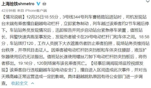 上海地铁微博表示,25日,上海地铁3号线344号列车曹杨路站进站时,司机发现站台末端有乘客擅自翻越电动栏杆,立即紧急制动,列车越过该乘客约2节车厢后停下。车站站务员发现情况后,迅即报告并同步启动站台紧急停车装置,值班站长、民警快速奔跑至事发处,发现伤者被卡在29号电动栏杆门和车体之间。