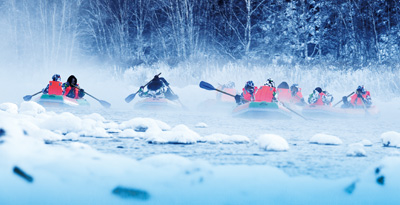 不冻河漂流的起点位于阿尔山国家森林公园内。套上鲜艳的救生衣,登舟、离岸,漂流就开始了。虽然气温极低,但伴随着一次次挥桨,严寒中的漂流也同样能令人热血沸腾。激起的水花溅到衣服上立即凝结成冰,不一会儿,手套、袖口和救生衣上就附着了一层“冰甲”。顺流而下,没有人声鼎沸,告别车马喧嚣,在毫无雕饰的自然环境中,体验最原始的漂流。