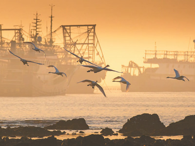 山东荣成,天鹅翔集。