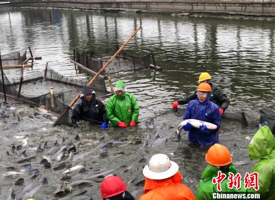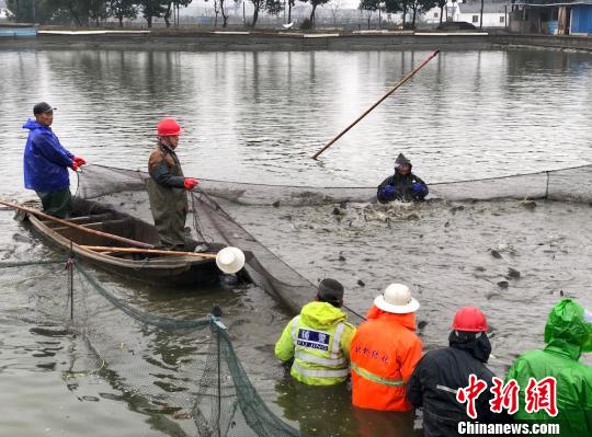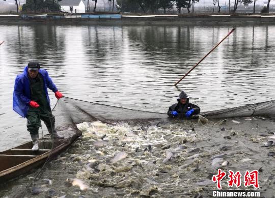 中新网无锡1月9日电 (记者 孙权)撒网、拉网、并塘、捞鱼、装筐……1月9日一早,位于无锡市锡山区鹅湖镇的青鱼标准化养殖示范基地内热火朝天,当地的渔民们冒着严寒下到冰冷的水塘中,将一尾尾“肥壮”的甘露青鱼捞起,感受别样的收获喜悦。