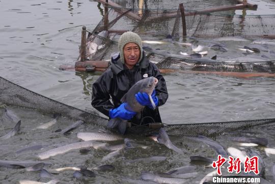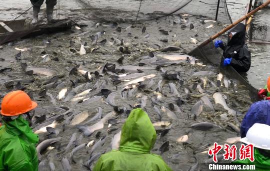 渔民抱着捕捞上来的青鱼。 孙权 摄