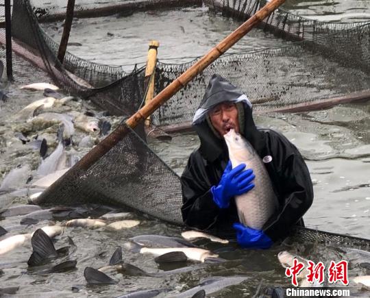 渔民干活之际不忘表达自己的喜悦之情,“亲吻”青鱼。 孙权 摄