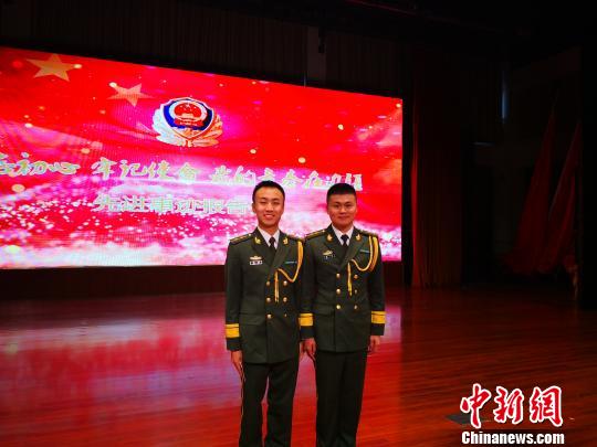 图为2018年5月,樊希(右)代表阿里支队参加西藏公安边防总队的先进事迹报告会。 西藏出入境边防检查总站 摄