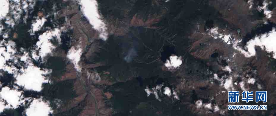 这是3月31日拍摄的木里火灾(中间冒烟处)卫星图片。新华社发