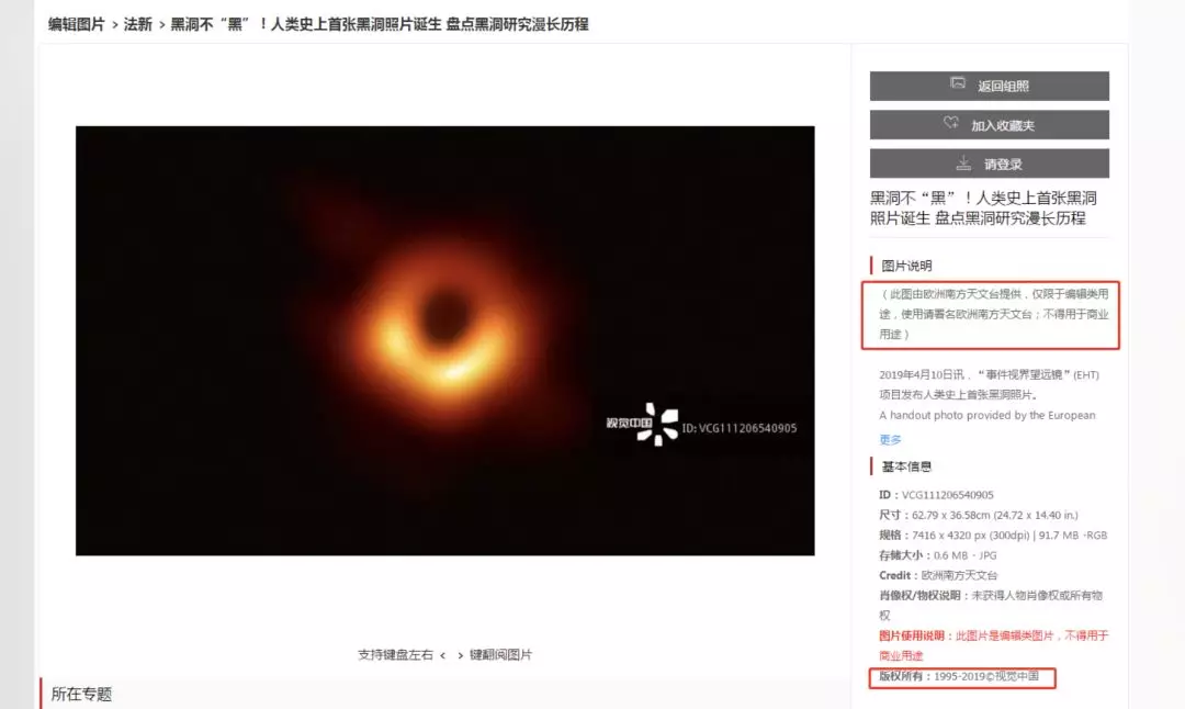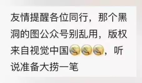 而在今天,在不少自媒体交流群中,一张截图让小编们冷汗直流。这张截图提醒公众号不要乱用这张黑洞照片,因为它的版权来自视觉中国,“听说准备大捞一笔”。