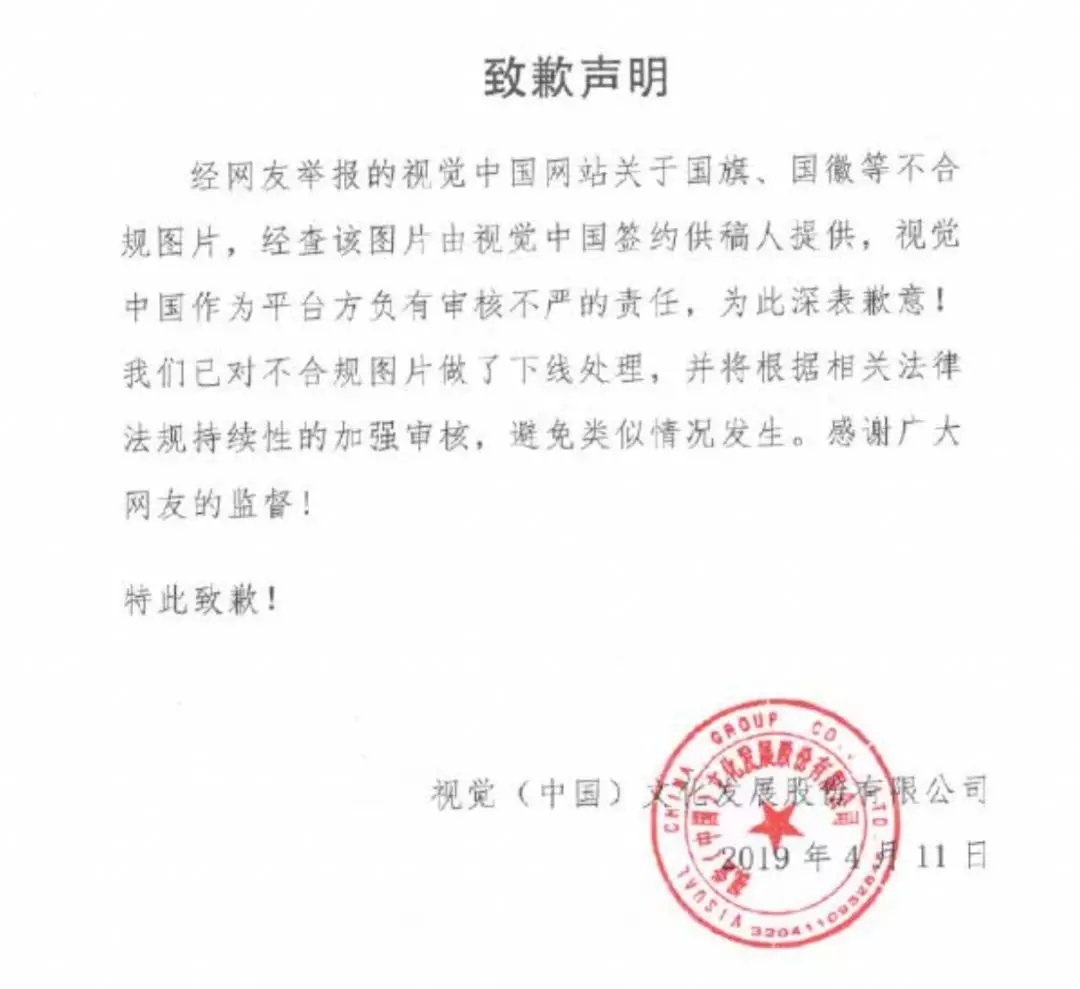 就国旗国徽图片不合规问题,视觉中国表示,经查该图片由视觉中国签约供稿人提供,平台方负有审核不严的责任,为此深表歉意。并表示已对不合规图片做了下线处理。