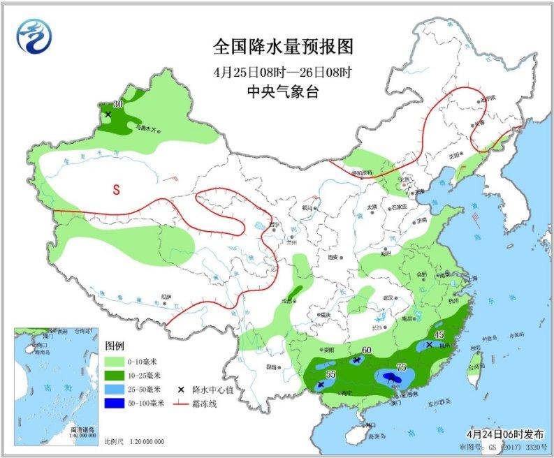 图6 全国降水量预报图(4月25日08时-26日08时)