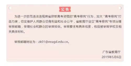 此外,广东省教育厅还公布了“高考移民”专项治理举报邮箱。