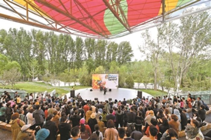 5月19日,游客在北京世园会妫汭剧场观看加勒比音乐节表演。
