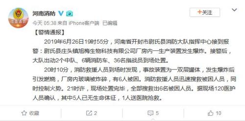中新网6月27日电 据河南省消防救援总队微博消息,2019年6月26日19时55分,河南省开封市尉氏县消防大队指挥中心接到报警:尉氏县庄头镇旭梅生物科技有限公司厂房内一生产装置发生爆炸。事故造成5人死亡,1人送医抢救。