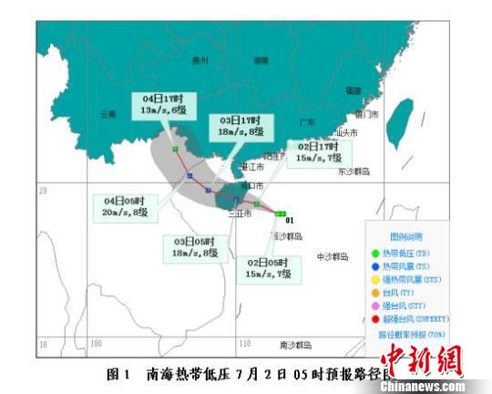 南海热带低压7月2日5时预报路径图。 海南省气象台供图 摄