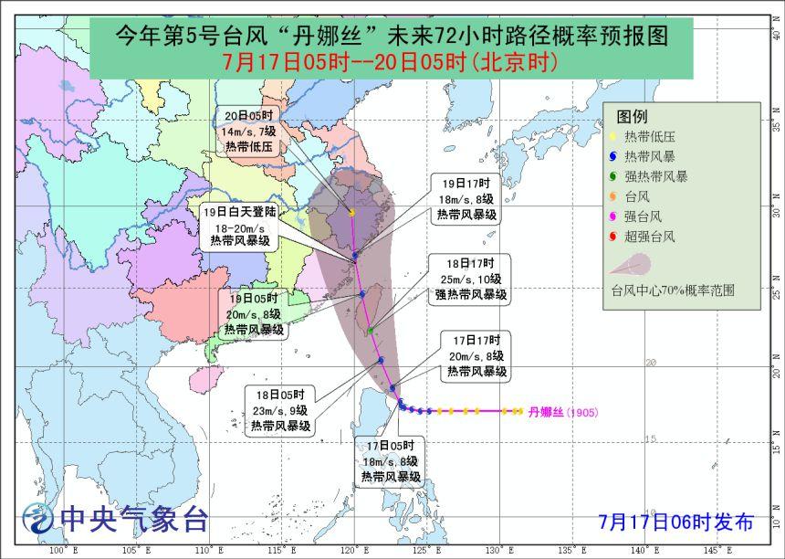 今年第5号台风“丹娜丝”(热带风暴级)的中心今天(17日)早晨5点钟位于台湾岛鹅銮鼻南偏东方大约520公里的西北太平洋洋面上。预计,“丹娜丝”将以每小时10公里左右的速度向北偏西方向移动,强度还将有所加强,最大强度可达9~10级(23~28m/s,热带风暴级或强热带风暴级),逐渐向台湾岛南部靠近(图1)。中央气象台17日06时继续发布台风预报。