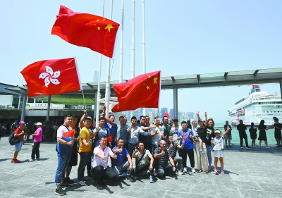 8日上午11时,尖沙咀天星码头,4名旗手举起旗杆,奋力挥舞起手中的中华人民共和国国旗和香港特别行政区区旗,聚集在周围的香港市民齐唱国歌。