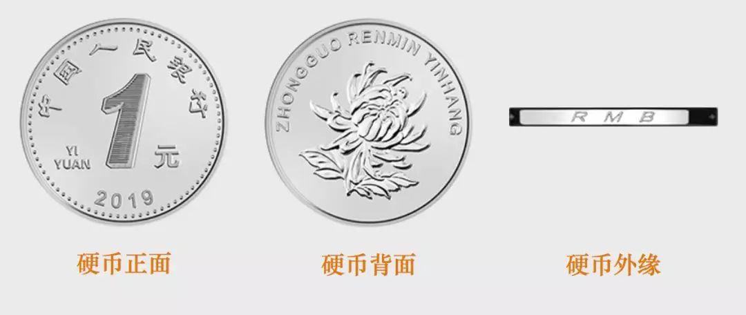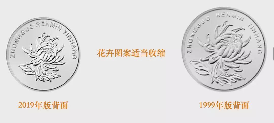 2019年版第五套人民币1元、5角、1角硬币分别保持1999年版第五套人民币1元、5角硬币和2005年版第五套人民币1角硬币外形、外缘特征、“中国人民银行”行名、汉语拼音面额、人民币单位、花卉图案、汉语拼音行名等要素不变,调整了正面面额数字的造型,背面花卉图案适当收缩。