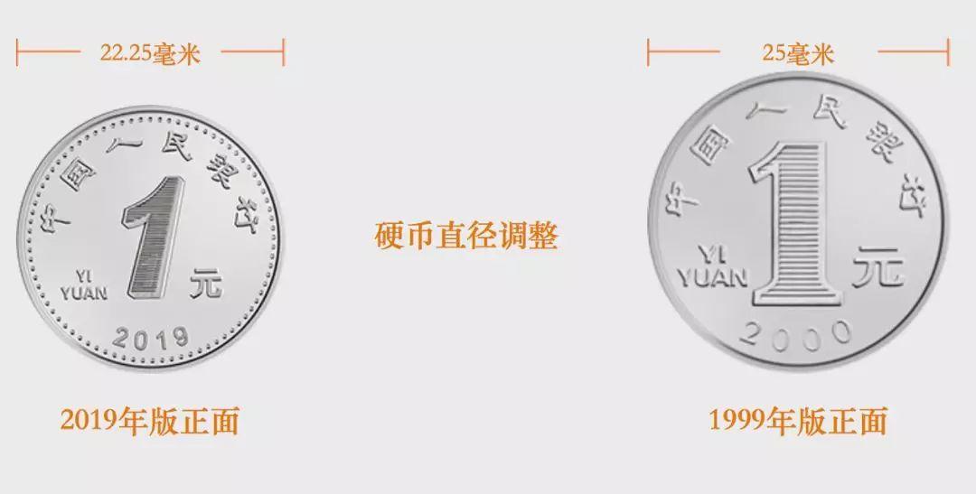 2019年版第五套人民币1元硬币保持1999年版第五套人民币1元硬币外形、外缘特征、“中国人民银行”行名、汉语拼音面额、人民币单位、花卉图案、汉语拼音行名等要素不变,调整了正面面额数字的造型,背面花卉图案适当收缩。直径由25毫米调整为22.25毫米。正面面额数字“1”轮廓线内增加隐形图文“¥”和“1”,边部增加圆点。材质保持不变。