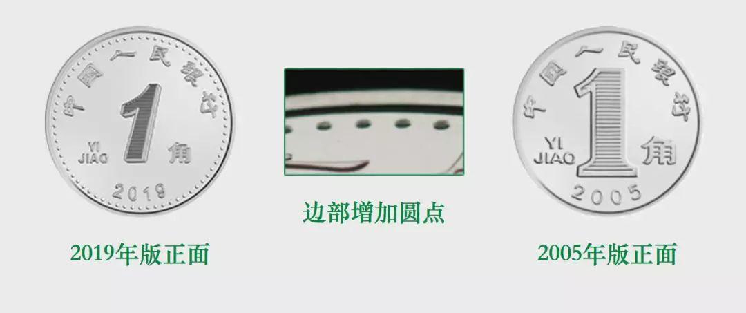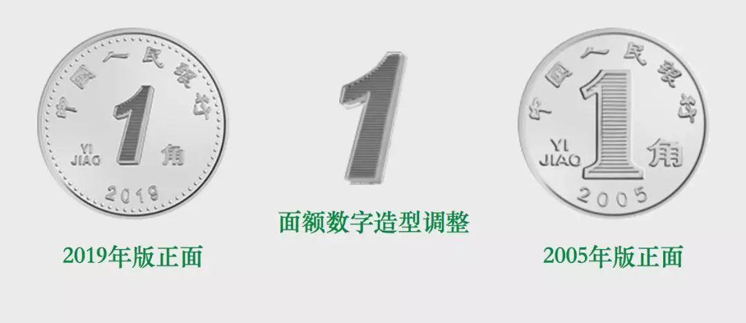 2019年版第五套人民币1角硬币保持2005年版第五套人民币1角硬币外形、外缘特征、“中国人民银行”行名、汉语拼音面额、人民币单位、花卉图案、汉语拼音行名等要素不变,调整了正面面额数字的造型,背面花卉图案适当收缩。正面边部增加圆点。直径和材质保持不变。