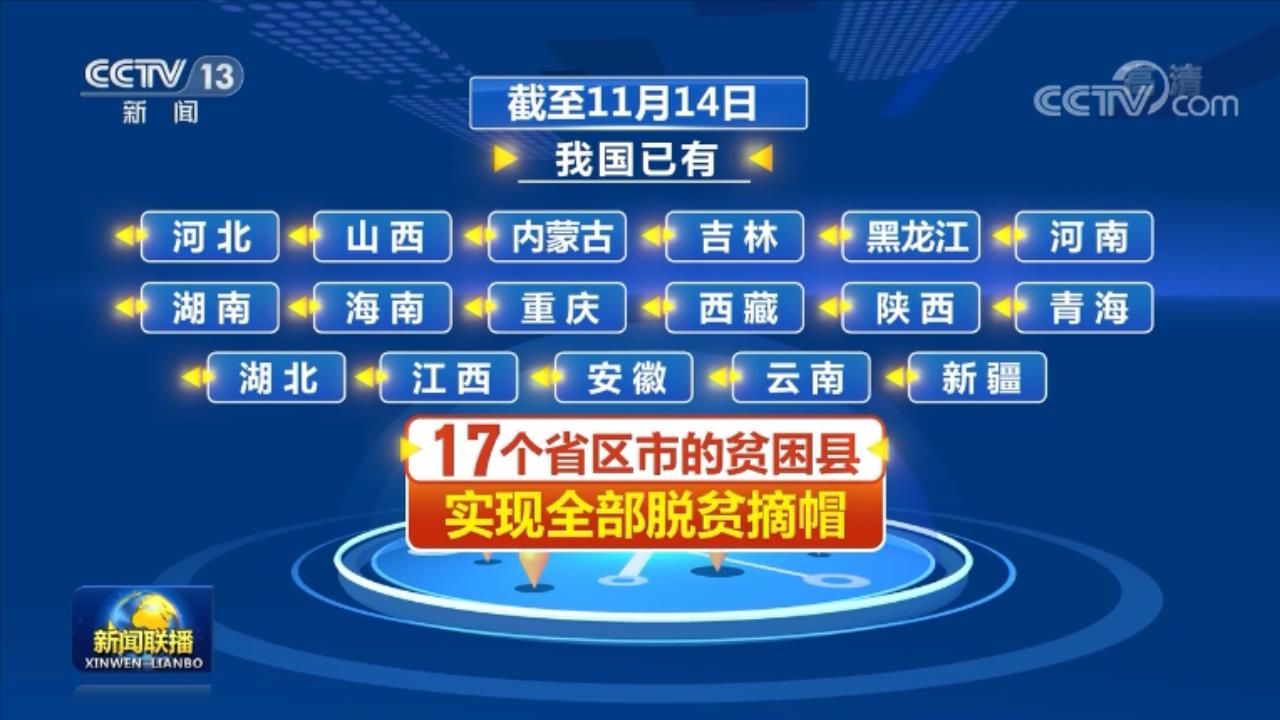 截至11月14日,我国已有河北、山西、内蒙古、吉林、黑龙江、河南、湖南、海南、重庆、西藏、陕西、青海、湖北、江西、安徽、云南、新疆等17个省区市的贫困县实现了全部脱贫摘帽。