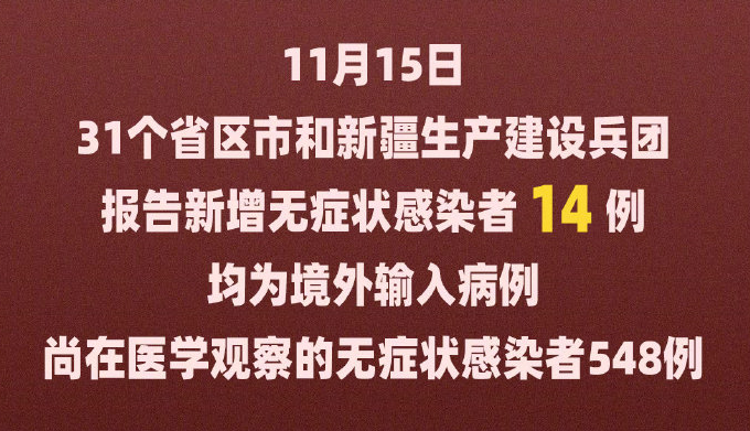 11月15日0—24时,31个省(自治区、直辖市)和新疆生产建设兵团报告新增确诊病例8例,均为境外输入病例。