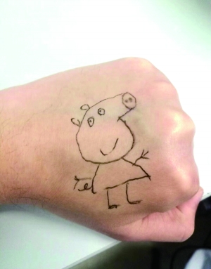 “偶然间,发现有小朋友的袜子忘在诊室了,粉红色的袜子上印着小猪佩奇。”杨磊回忆。杨磊灵机一动,决定在左手手背上画一个小猪佩奇。酷似电吹风的外形,简单的简笔画,杨磊在1分钟时间就简单描了一个小猪佩奇。“来看病的小朋友很多是要哭要闹的,但是看到小猪佩奇,就觉得很好玩,没那么情绪激动了。”杨磊说。直到当天上午11点半,杨磊陆陆续续又看了15个左右的病人,“对于年龄小的病人有作用,对于年龄偏大的病人小朋友,就没啥效果了。”