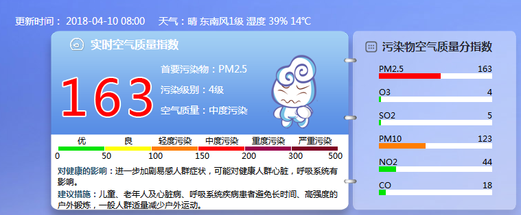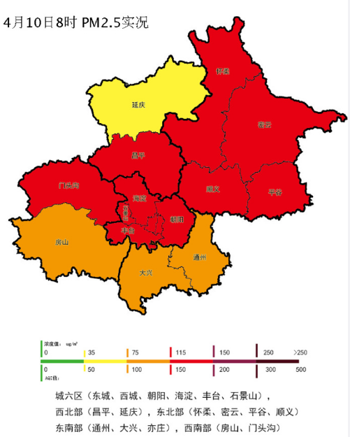 截至4月10日8时,城六区PM2.5浓度:123(微克/立方米);西北部:102(微克/立方米);东北部:123(微克/立方米);东南部:101(微克/立方米);西南部:110(微克/立方米)。