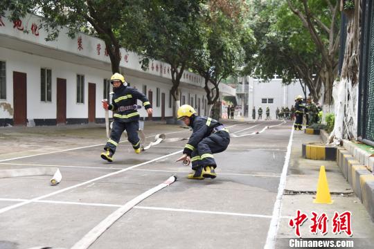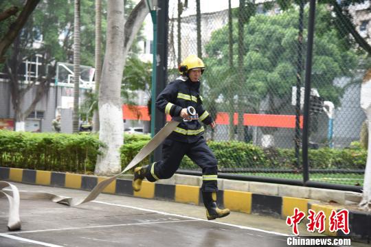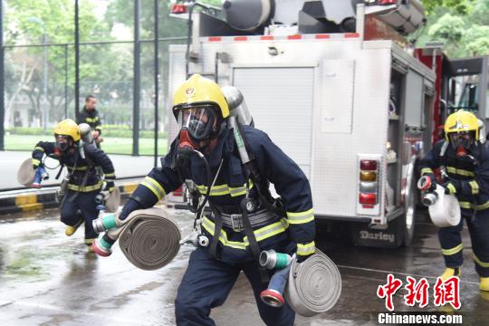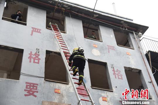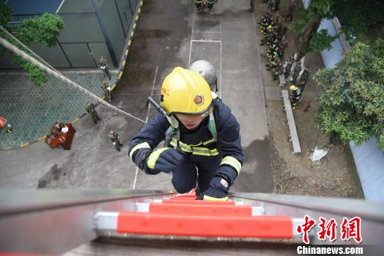 消防官兵在进行水罐车楼层灭火训练。 王以照 摄