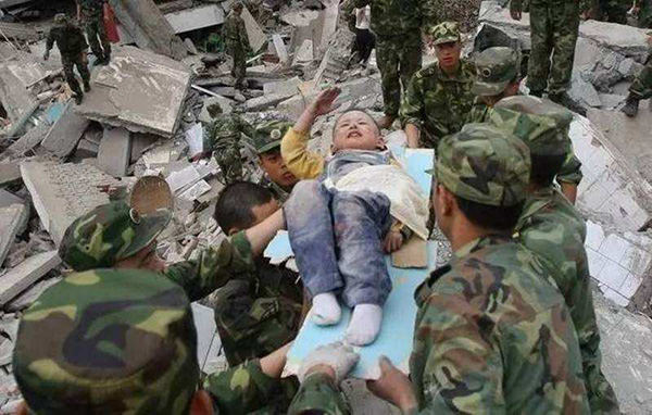 5月13日早晨7时左右,北川县曲山幼儿园废墟中,传来小孩时断时续的哭声,被掩埋长达20小时的小男孩,所幸被解放军战士救出。他躺在一块小门板做的临时担架上,一边说着“谢谢叔叔”,一边举高稚嫩的右手,向8位战士敬礼,记者用相机记下这一幕。