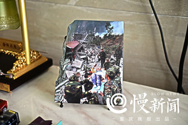 郎铮家里客厅的电视柜上,摆放着当年他在地震中获救时敬礼的照片。