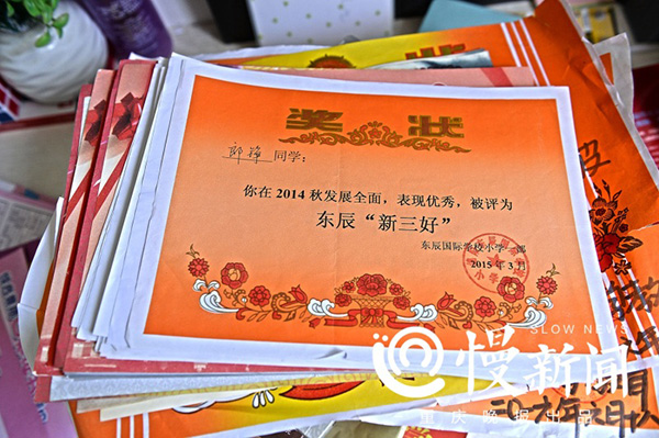 教过郎铮的老师都说,这孩子成绩拔尖,年级前茅,学习能力强,尤其作文写得不错。当过班长、班长助理、篮球队长,他的奥数、英语奖状,以及好学生奖状已经厚厚一叠,就堆在他的书桌旁。