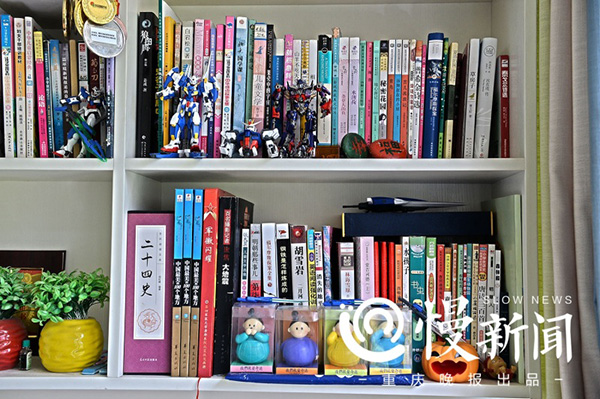 阳台的书架上,堆满了郎铮喜欢看的书。