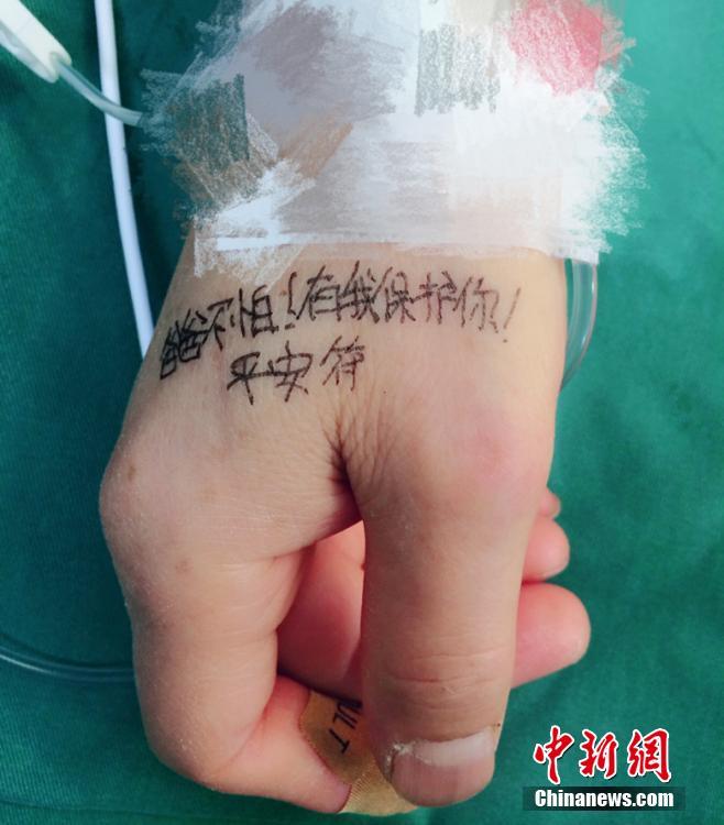 山西省肿瘤医院手术室,女儿在即将做手术的普外患者手上留下特别的嘱咐。医务人员说,只有更努力,才对得起身后每一双充满信任和期待的眼神。 张建祥 摄
