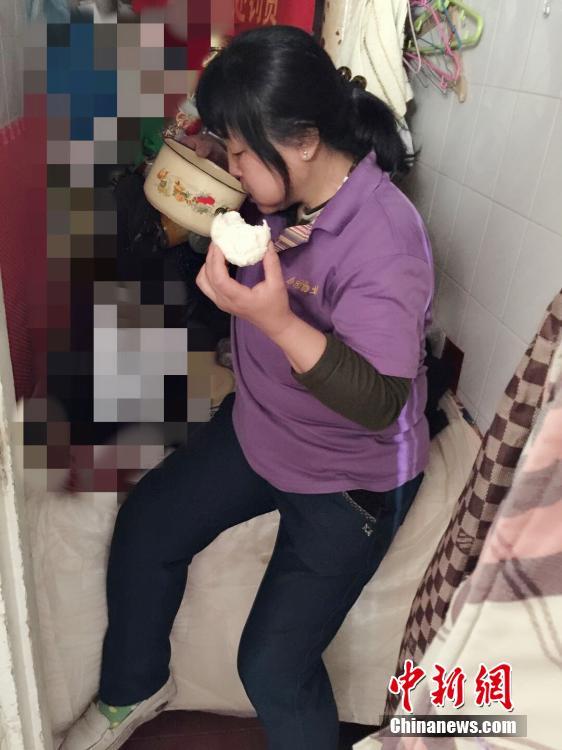 山西省肿瘤医院内科住院大楼,保洁员凌晨4点开始一天的工作,直到上午10点半才抽空躲在狭窄的休息间吃早饭。 山西省肿瘤医院供图