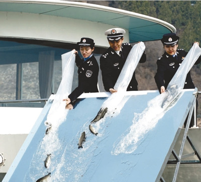 今年,北京市计划增殖放流苗种不低于1000万尾、增殖水域面积不少于30万亩。近日北京市农业局渔政管理站与密云水库执法大队工作人员在船上投放鱼苗。