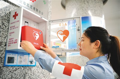 近日,陕西西安市红十字会在大雁塔景区、西安火车站候车大厅、陕西历史博物馆等人流密集场所安装了13台自动体外除颤仪(AED),用于突发情况下的应急救护。此次安装的自动体外除颤仪面向非医务人员设计,操作简单易学。在意外发生时,操作者可按照语音提示为患者实施急救。图为志愿者在西安市政务服务中心检查自动体外除颤仪。